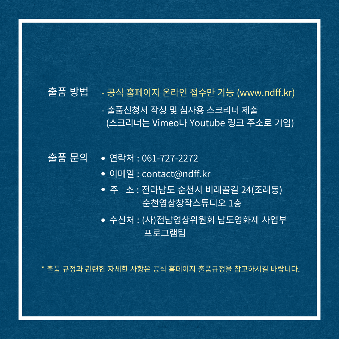 경쟁작 출품은 오는 7월 31(월) 15:00까지 영화제 공식 홈페이지(www.ndff.kr)에서 접수가 가능하며, 장/단편 모두 접수 가능하오니 많은 참여 바랍니다!